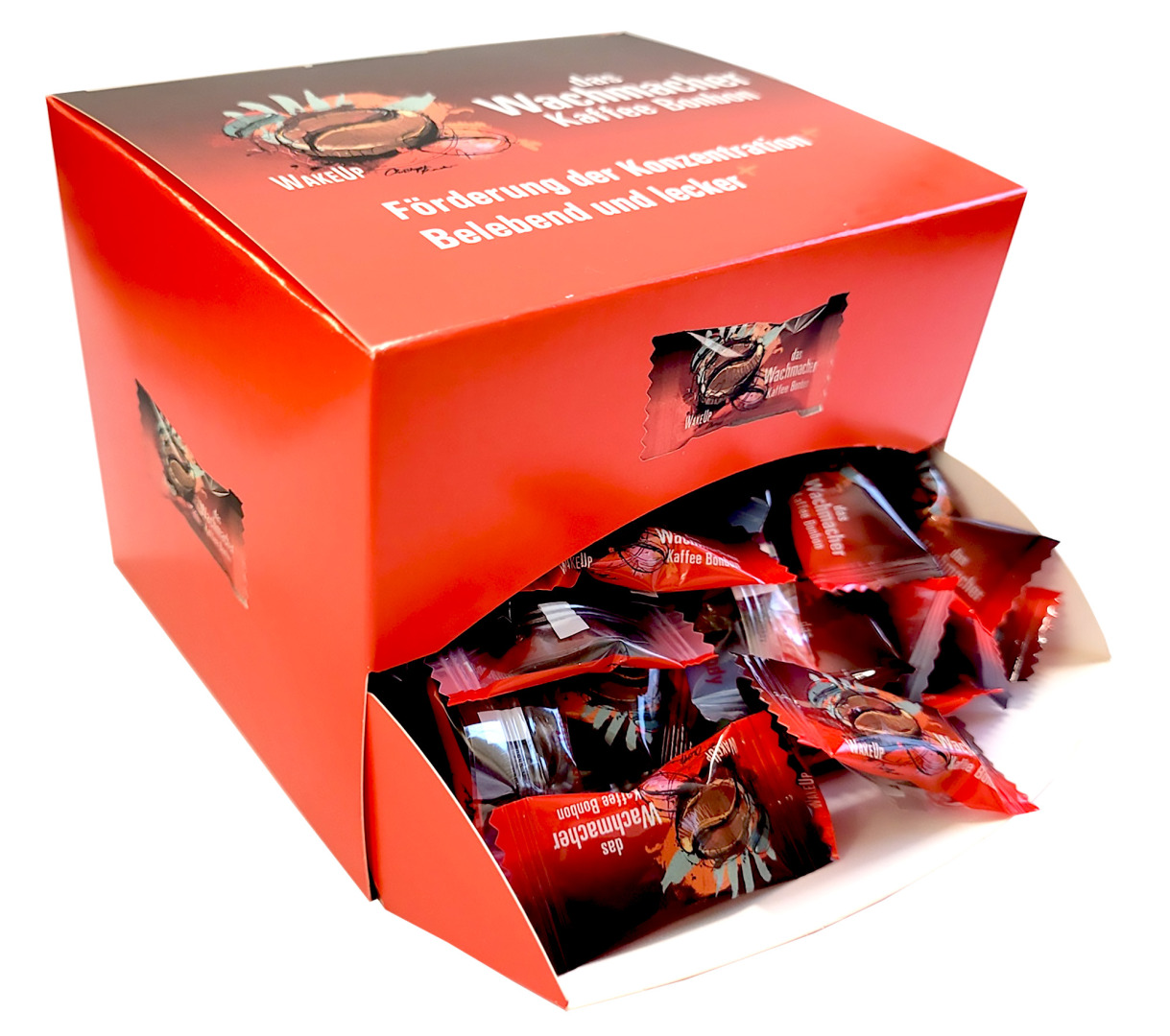 At the last ISM, the WakeUp Coffee Candy celebrated its premiere in a 45g zip-lock bag. Some candies were packaged in flowpacks for distribution at the trade fair. The flowpacks attracted so much attention, that the idea for a new packaging variant was born. The new product is now ready for market and available in a practical 350g dispenser box. The box contains at least 100 individually flowpacked WakeUp Coffee Candies, making it ideal for meeting rooms, conference hotels, car dealerships, restaurants, or any company that wants to offer their employees, customers, or visitors a little pick-me-up. The WakeUp Coffee Candies have also evolved in other ways. In addition to the 15-bag counter display, an eye-catching floor stand in Chep format is now available. This can hold up to 108 candies on an integrated hook wall. This stand brings additional attention, especially for launches in supermarkets or gas station shops. The Coffee Wake-Up Candy impresses with its unique, sophisticated coffee flavor and the addition of caffeine. The candy, shaped like a coffee bean, combines wholesome enjoyment with an energy boost and a powerful wake-up effect.