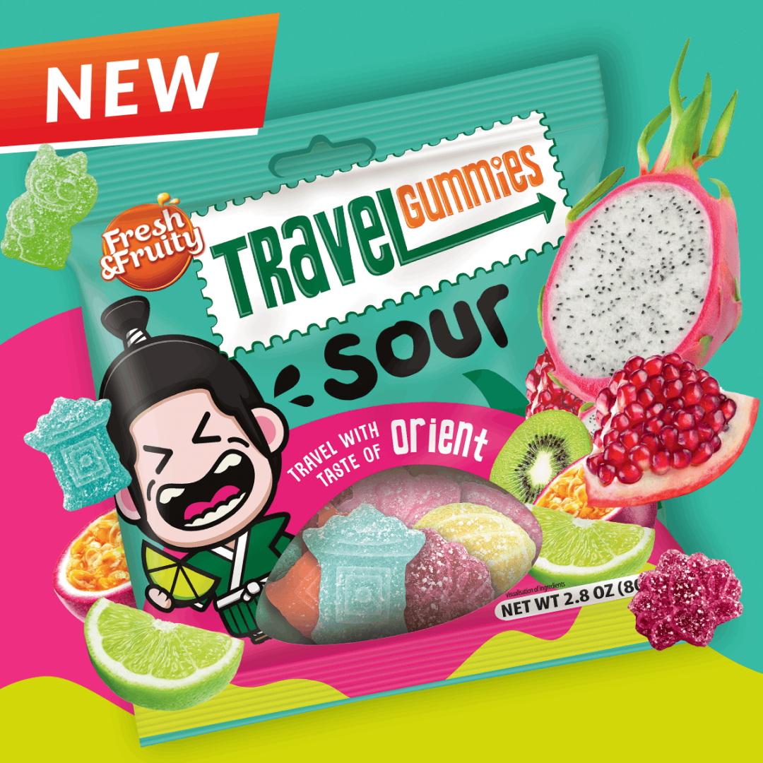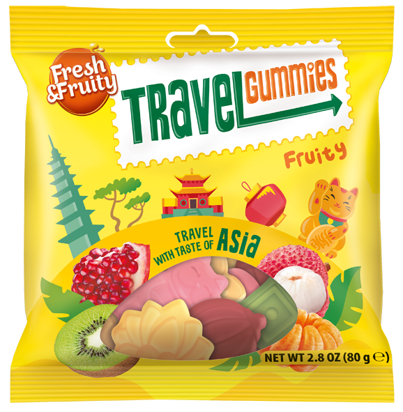 NEW! TRAVEL GUMMIES SOUR: A vibrant fusion of oriental flavours and tropical fruits, captured in unique shapes inspired by Far Eastern symbolism. The new fruity flavours include grapefruit, dragon fruit, kiwi, pomegranate, lime and passion fruit. Each gummy is a little flavour-packed adventure that transports you to distant corners of the world - from the mysterious streets of Thailand to the exotic gardens of Japan.