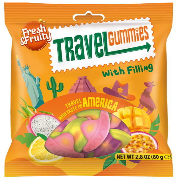 TRAVEL GUMMIES AMERICA: Gummies with fruity fillings, including passion fruit & mango, dragon fruit & lemon, and prickly pear & pomegranate.